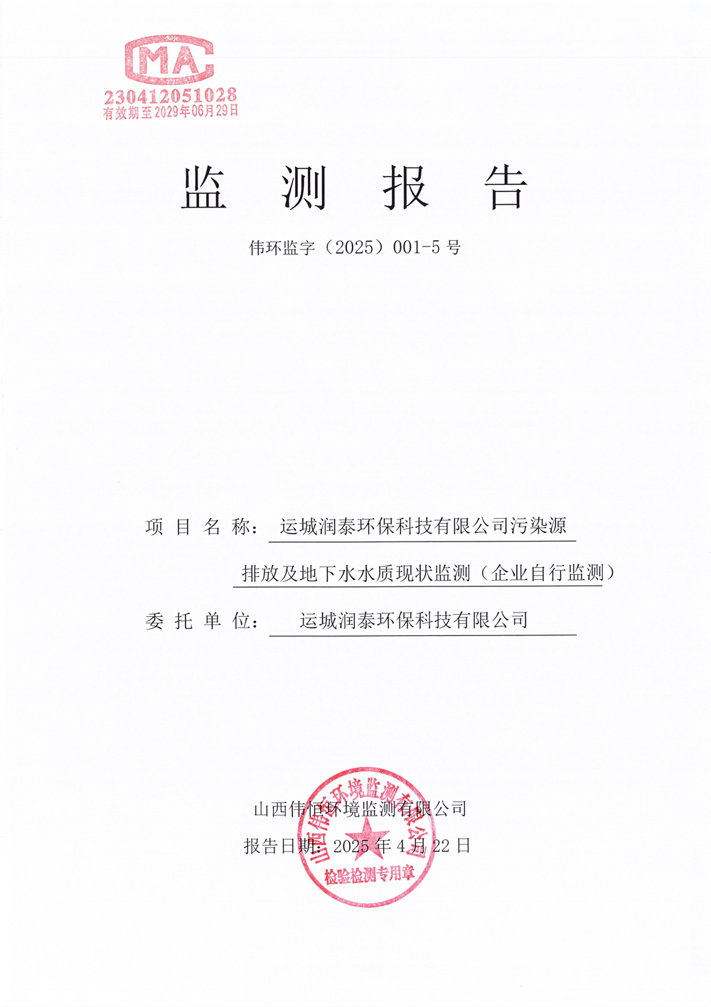 2025年潤泰環(huán)保四月份自行監(jiān)測報(bào)告