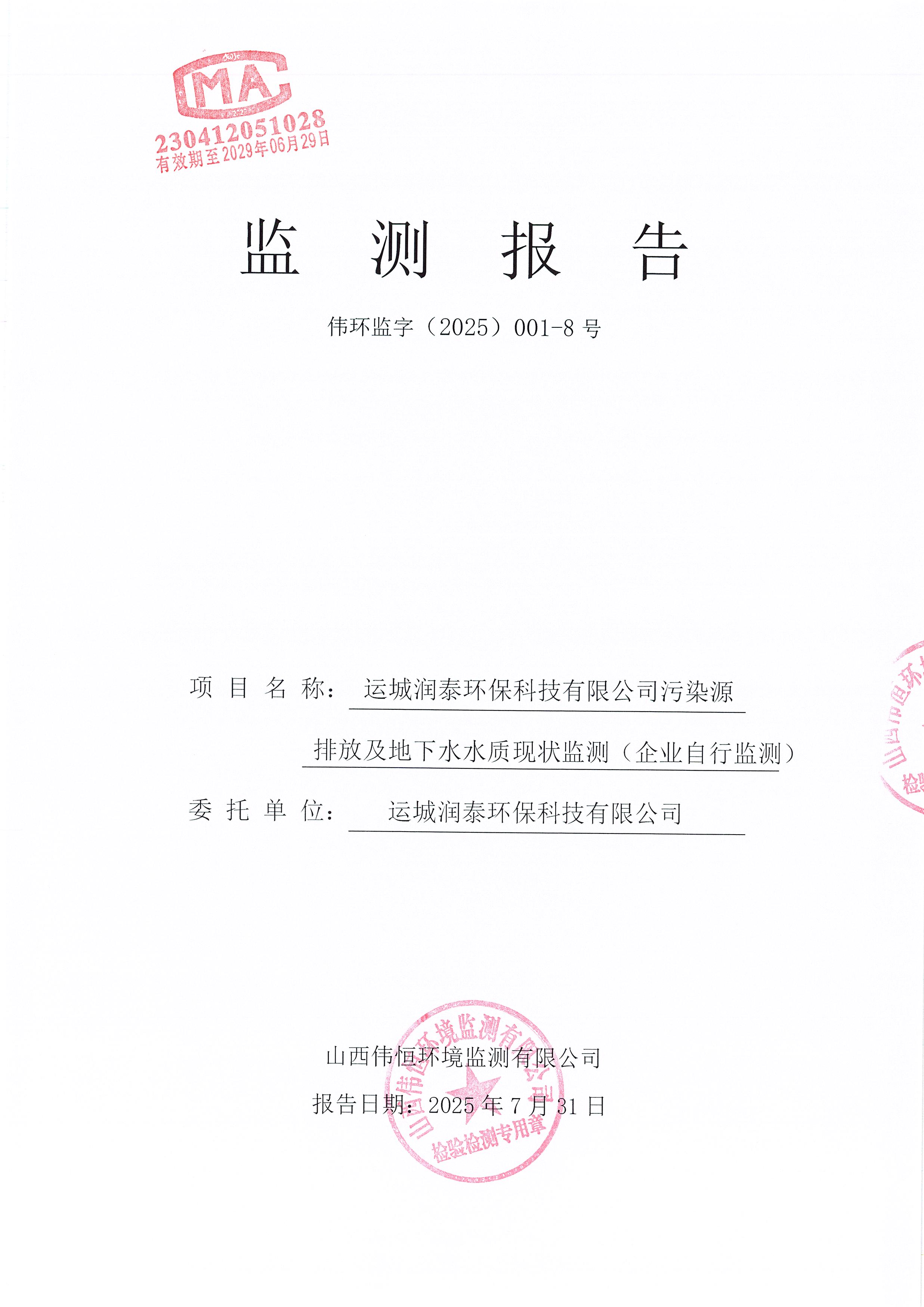 2025年潤泰環(huán)保七月份自行監(jiān)測報告